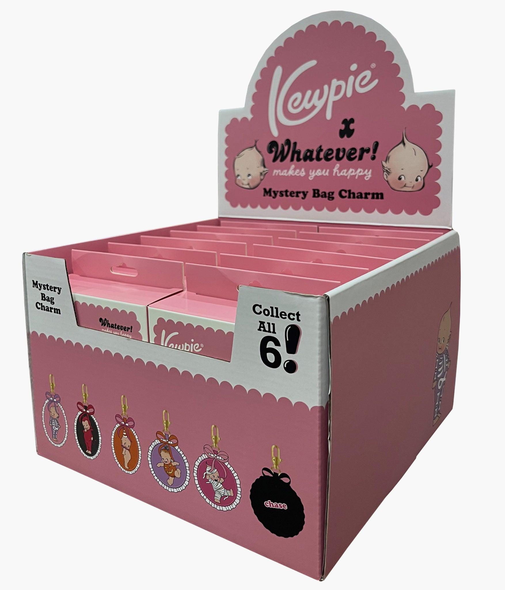 Step into the whimsical world of Kewpie with these mystery padded ribbon bag charms! Each charm features an adorable Kewpie character framed with a sweet satin ribbon and printed details, making them the perfect collectible accessory for your bag, keys, or display shelf. The thrill is in the mystery—you won’t know which charm you’ll receive until you open the box! With 6 playful variations to collect (including a rare chase design), every unboxing is a delightful surprise. From skeleton costumes to pumpkins, mummies, and more, these charms capture Kewpie’s mischievous yet lovable spirit.