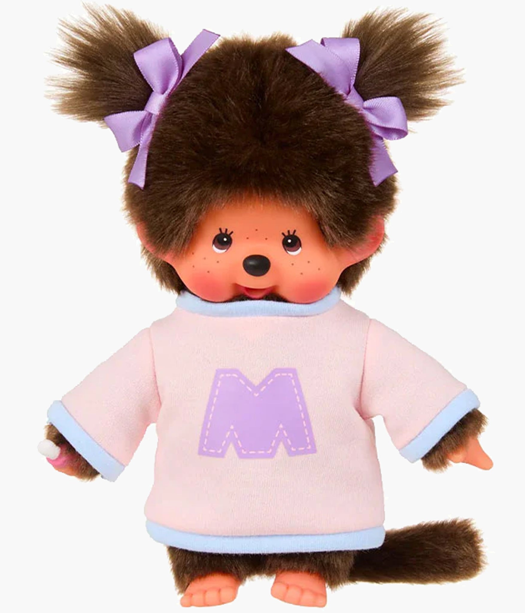 Monchhichi Girl looks extra fashionable in her pink and blue bi-color sweater! We love the large purple "M" on her sweatshirt and the matching purple bows on her pigtails!