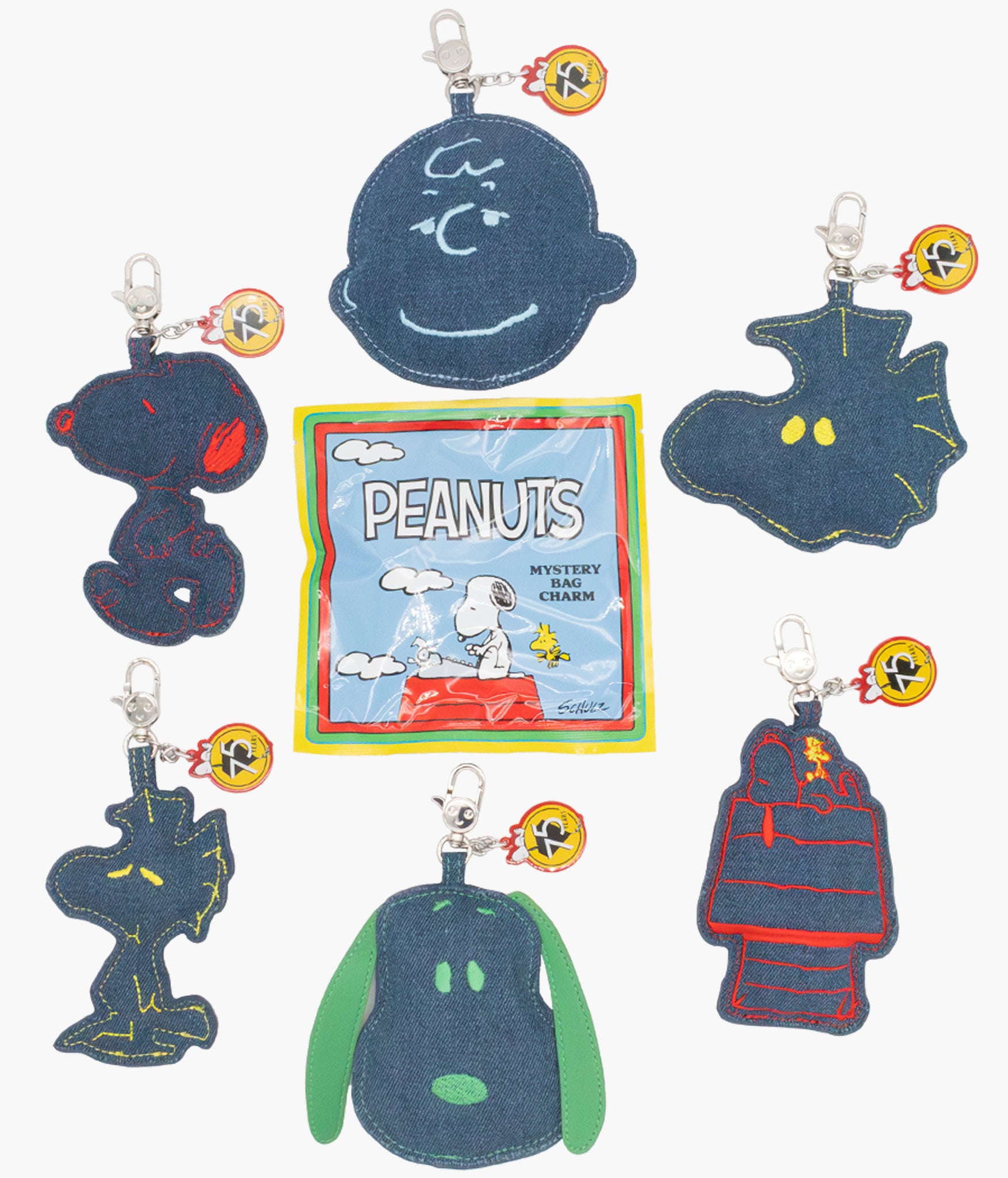 Celebrate 75 incredible years of Peanuts with the Peanuts 75th Anniversary Mystery Bag Padded Denim Character Bag Charms—a collectible tribute to Charles Schulz’s timeless legacy. Can you believe it’s been three-quarters of a century since Snoopy first took his iconic nap atop his doghouse? These denim bag charms perfectly complement every piece in the Peanuts 75th Anniversary Collection. The contrast stitch detailing pops beautifully against the rich, dark denim, giving these charms a premium, high-fashion feel while still celebrating the playful spirit of the Peanuts gang. Each mystery bag is sold blind, adding an extra layer of excitement—you never know which character you’ll get! Will you pull Snoopy, Woodstock, or Charlie Brown? Each padded denim charm also comes with an acrylic 75th Anniversary emblem charm, making these mini accessories both nostalgic and collectible. Whether you’re clipping one onto your tote, backpack, or crossbody, these charms deliver the perfect mix of retro craftsmanship and modern fandom. Collect them all and carry a little piece of happiness—and Peanuts history—wherever you go.