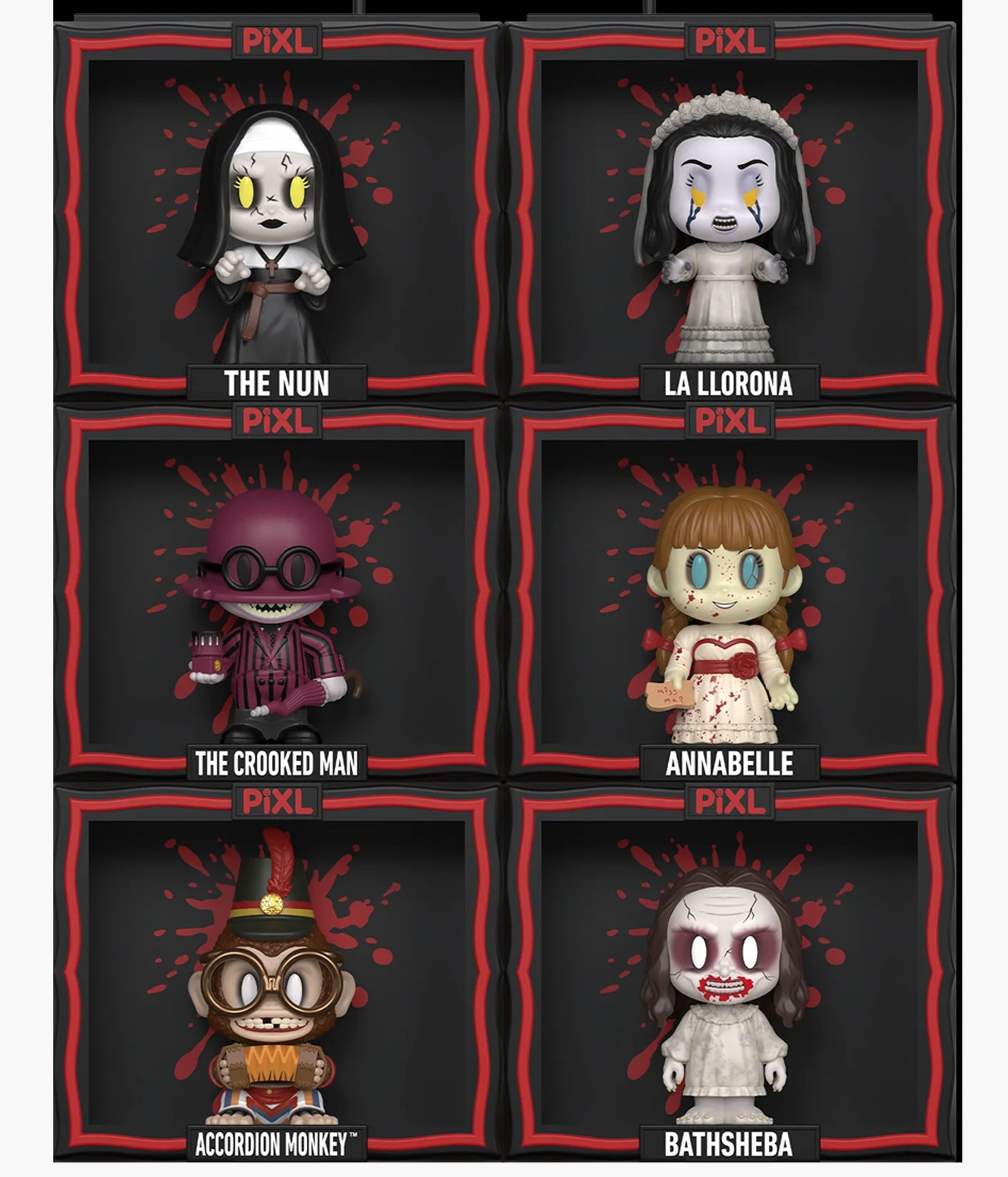 These characters may be tiny, but they’re just as horrifying! In this mystery box, you have the chance to pull of one these haunting characters: The Nun, La Llorona, The Crooked Man, Annabelle, Accordion Monkey, or Bathsheba.